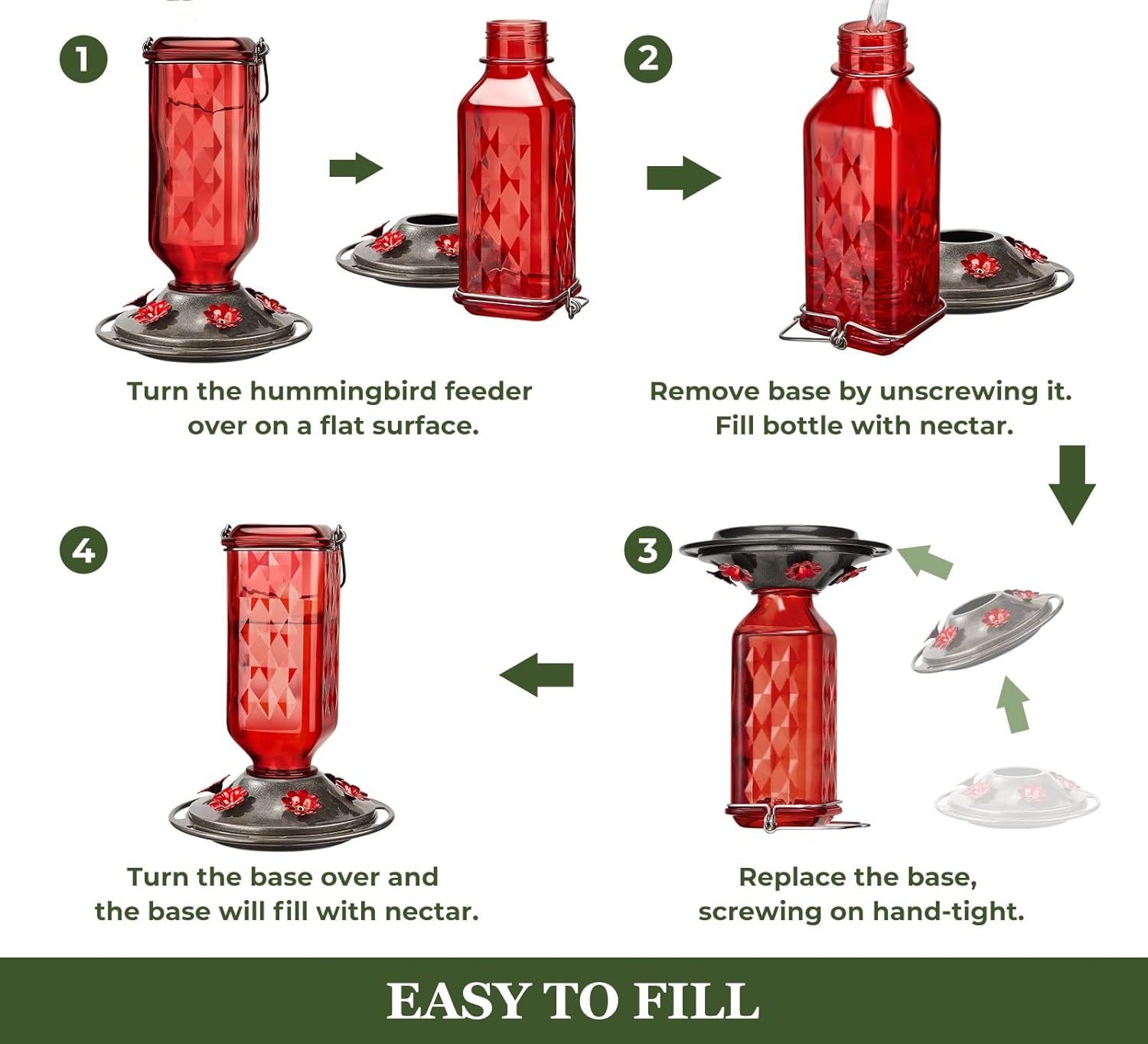 Easy to Maintain: Holds up to 24 oz of nectar. The wide-mouth bottle makes filling and cleaning effortless, and the entire feeder easily disassembles for thorough cleaning